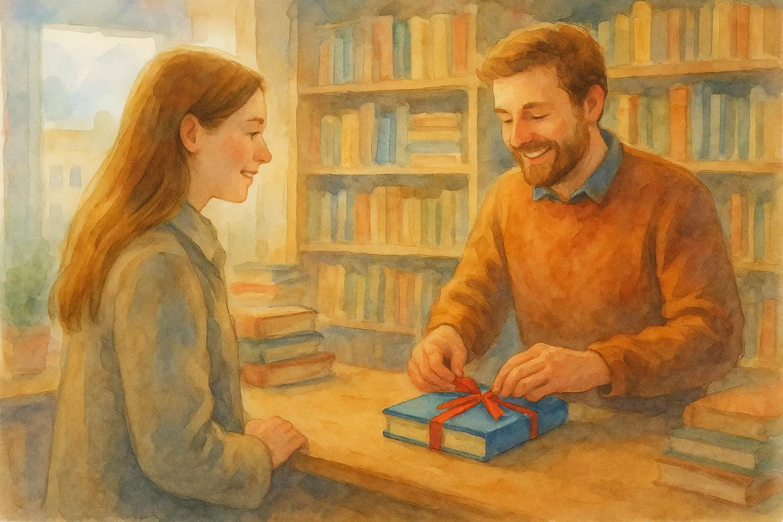 After school in a Norwegian town, Nora searches a small bookstore for a birthday gift for her best friend Ida. She chooses a blue notebook, gets it wrapped, and gives it at the party that evening.