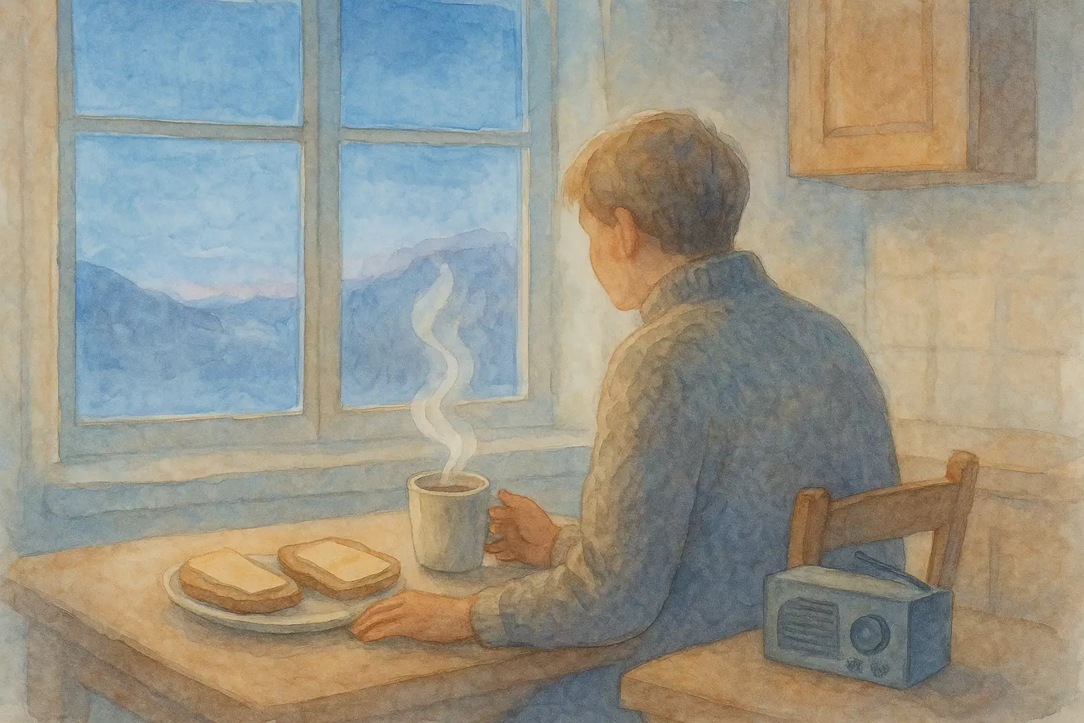In a small Norwegian apartment, one person wakes at seven, makes coffee and simple breakfast, and gets ready to catch the bus. The story follows their calm steps from alarm to doorway.