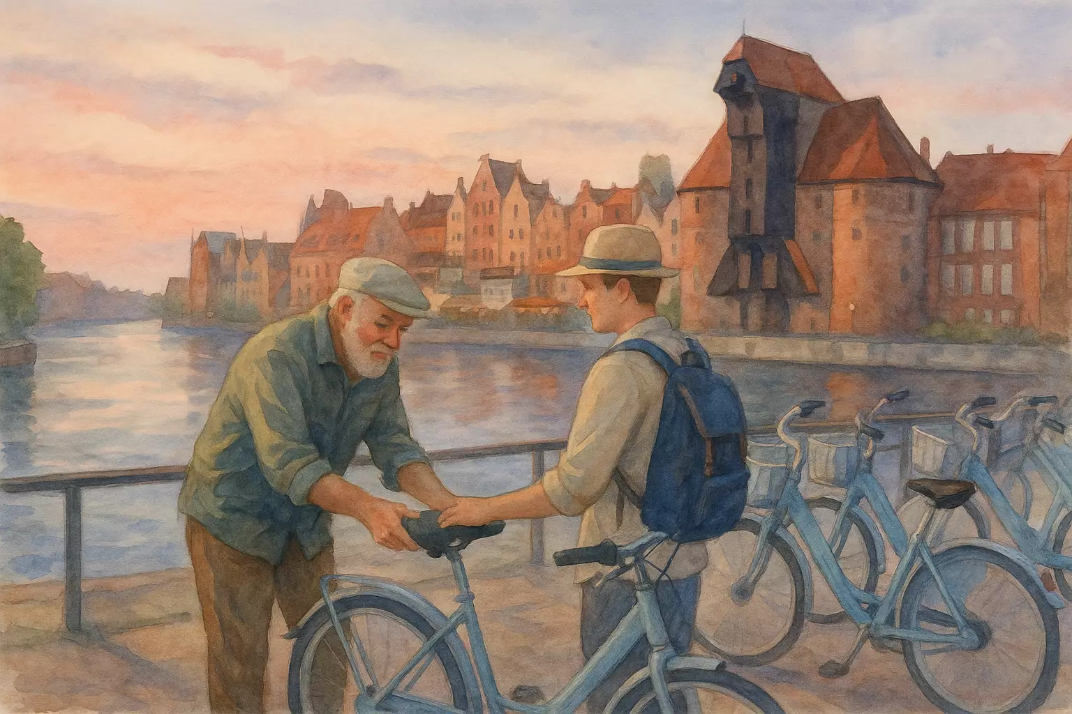 A weekend visitor in Gdańsk struggles with a freezing app and ends up renting a city bike at a riverside station with the help of an older attendant. After a satisfying ride and a small scare returning the bike, the deposit is released and the narrator plans to rent again.