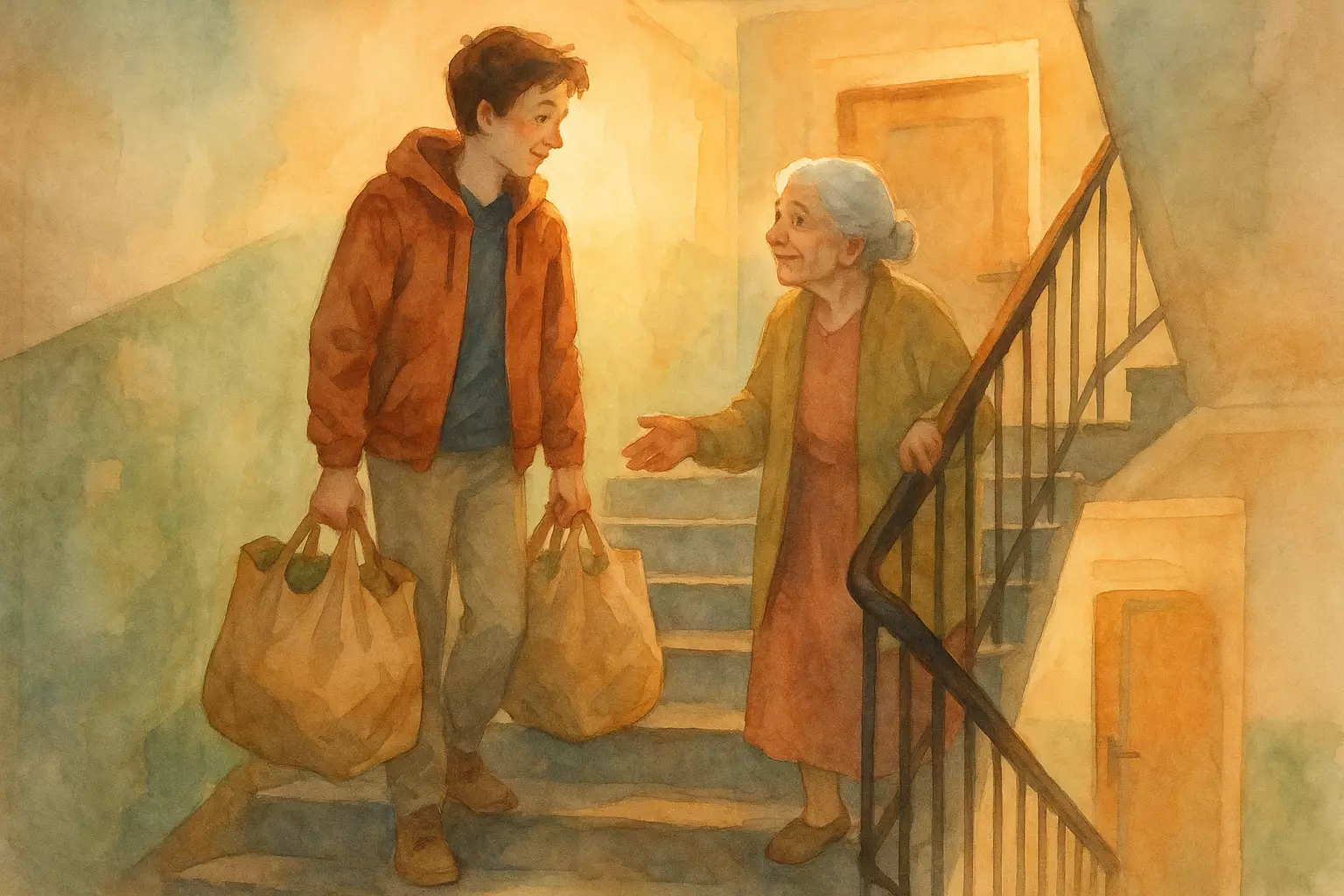 A young person returns home to a Warsaw apartment building and helps an elderly neighbor carry heavy bags. They share tea, talk briefly, and the helper decides to visit more often.