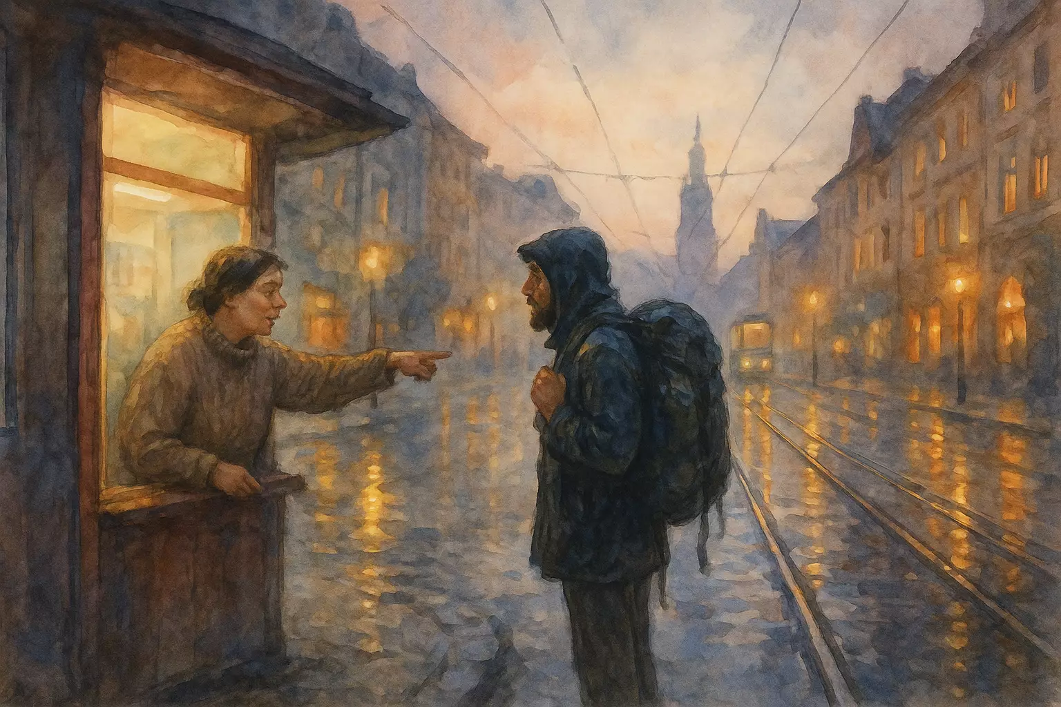 A traveler gets lost in rainy Wrocław after his phone dies, and with help from a kiosk seller and the logic of tram tracks, he finds his way to a hostel on Wyspa Słodowa. The story explores how surrendering control can turn disorientation into discovery.