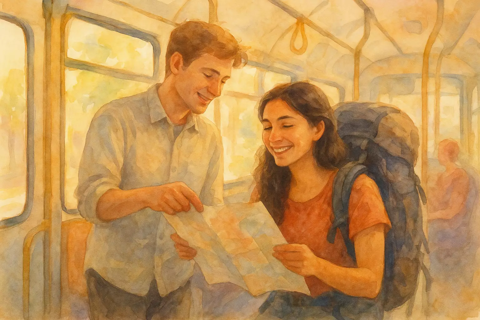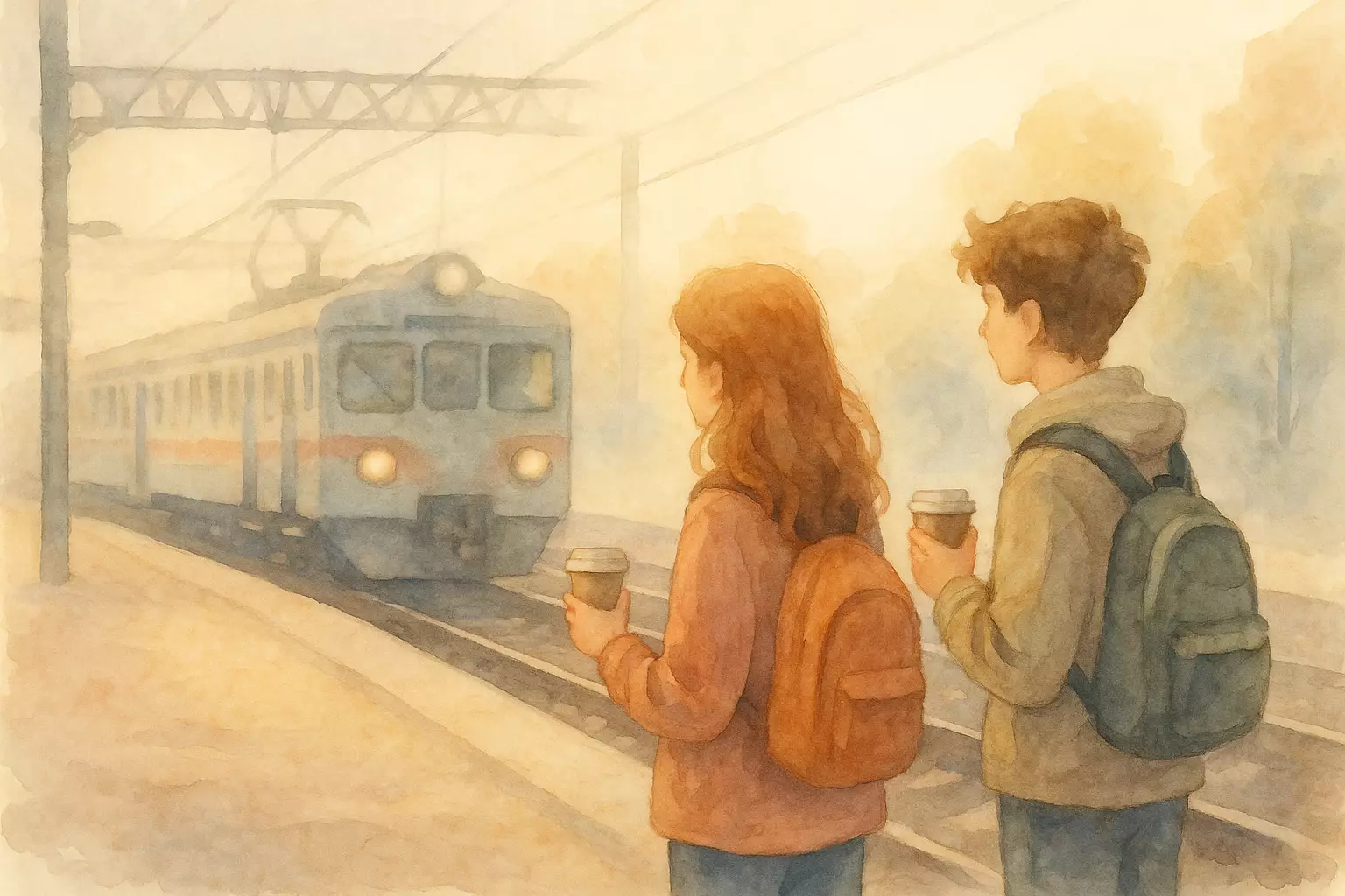 Two friends plan a short trip to Gdańsk by train. They check the weather, book a hostel, pack, and meet at the station to start their journey.