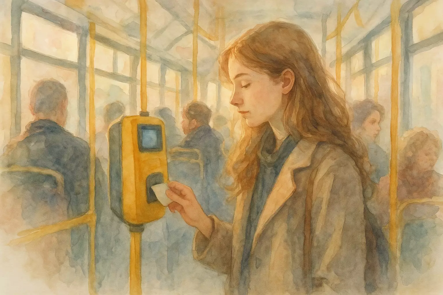 Ania takes a crowded tram to work in a Polish city. She validates her city card, helps a tourist, passes a ticket inspection, and arrives on time.