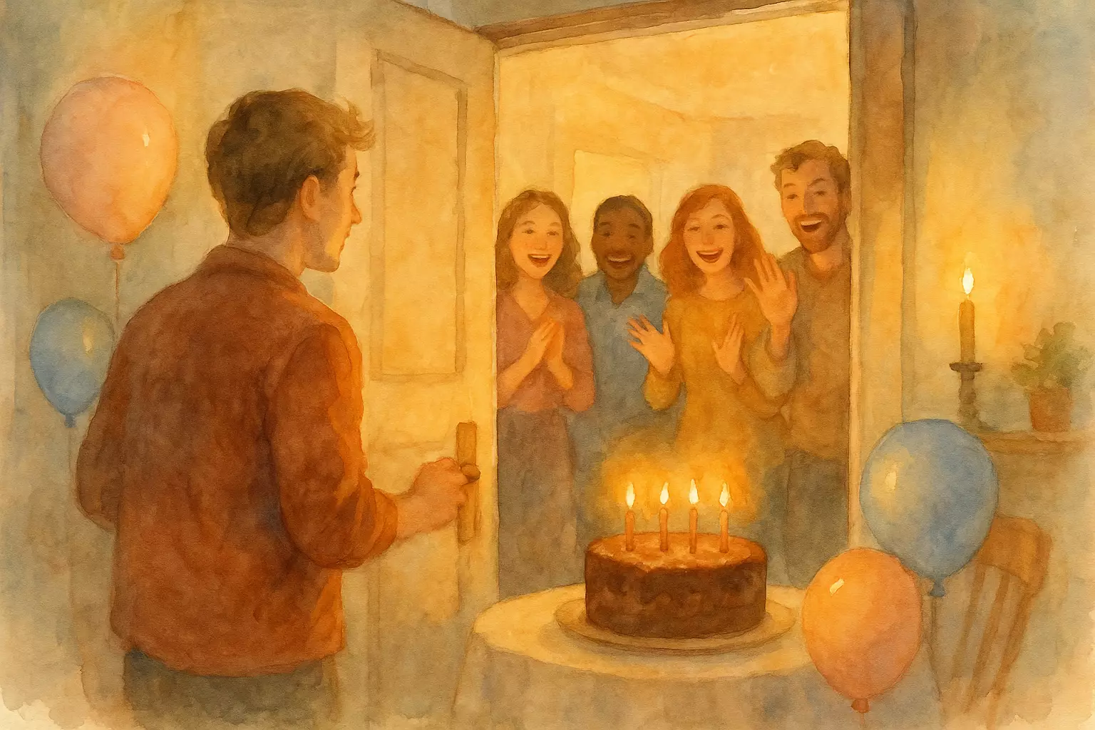 Friends plan a surprise birthday for Tomek in a small Warsaw apartment. They shout “Sto lat!”, share cake, and even a neighbor briefly joins after knocking about the noise.