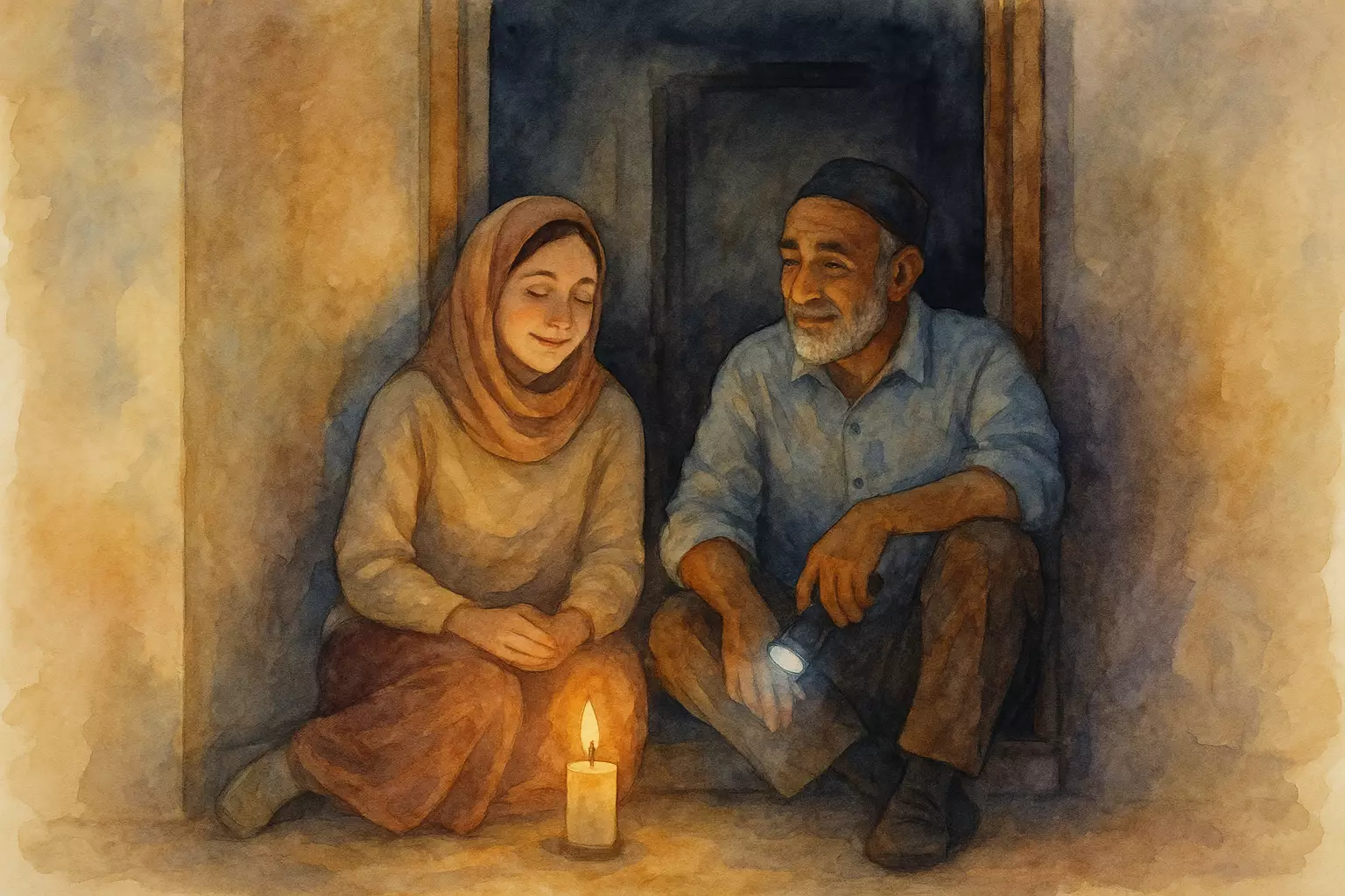 On a cold November evening in a Swedish apartment, the power goes out and Sara meets her neighbor Ahmed; they sit in the hallway, share a cinnamon bun, and wait until the lights return.