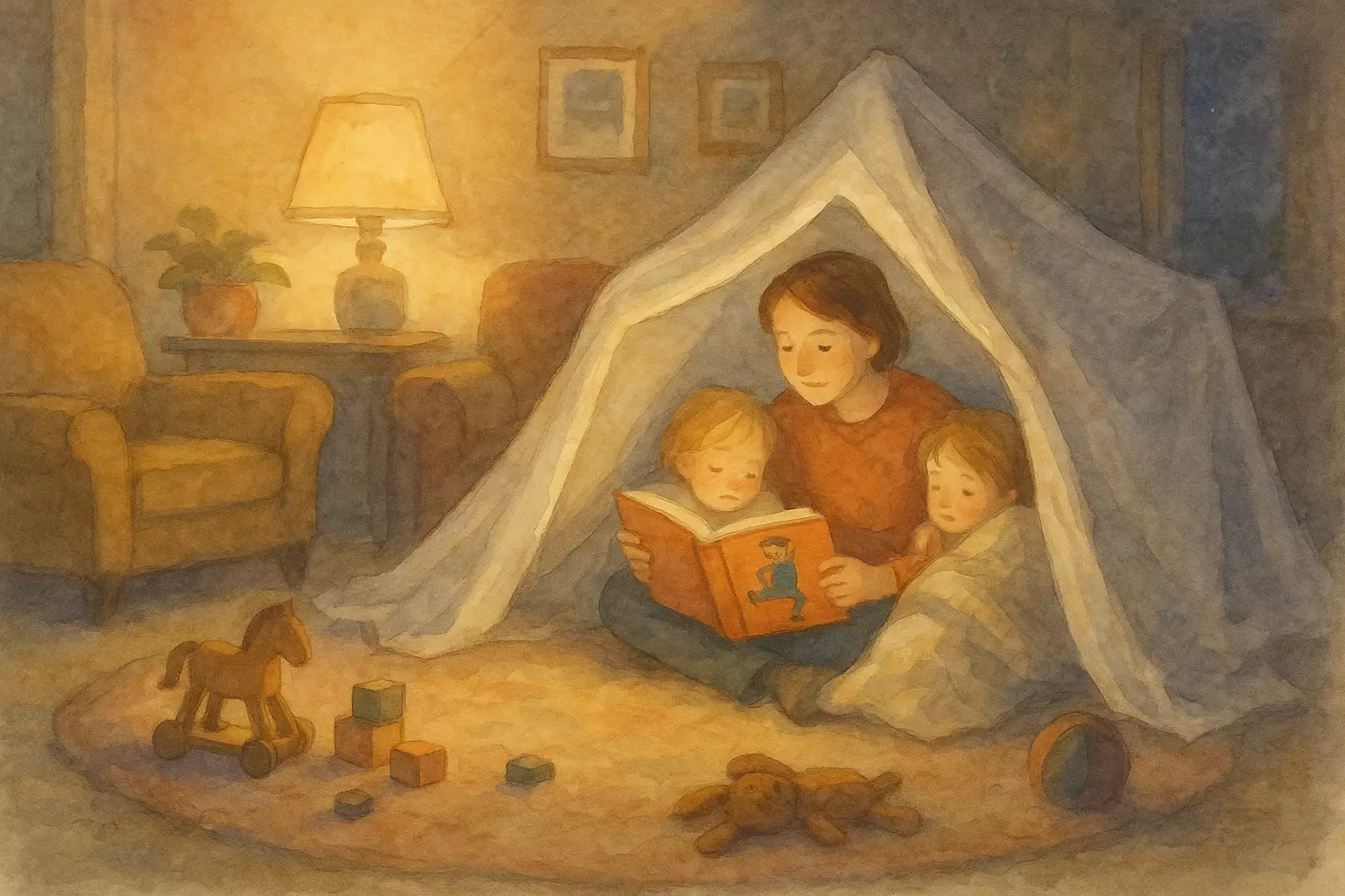 A neighbor in Sweden frantically asks the narrator to babysit two young siblings for an evening delayed by commuter trains, leading to negotiations about screen time, a wobbling blanket fort, and a calm bedtime with books and songs. The narrator discovers an unexpected fondness for stepping in and holding the fort.