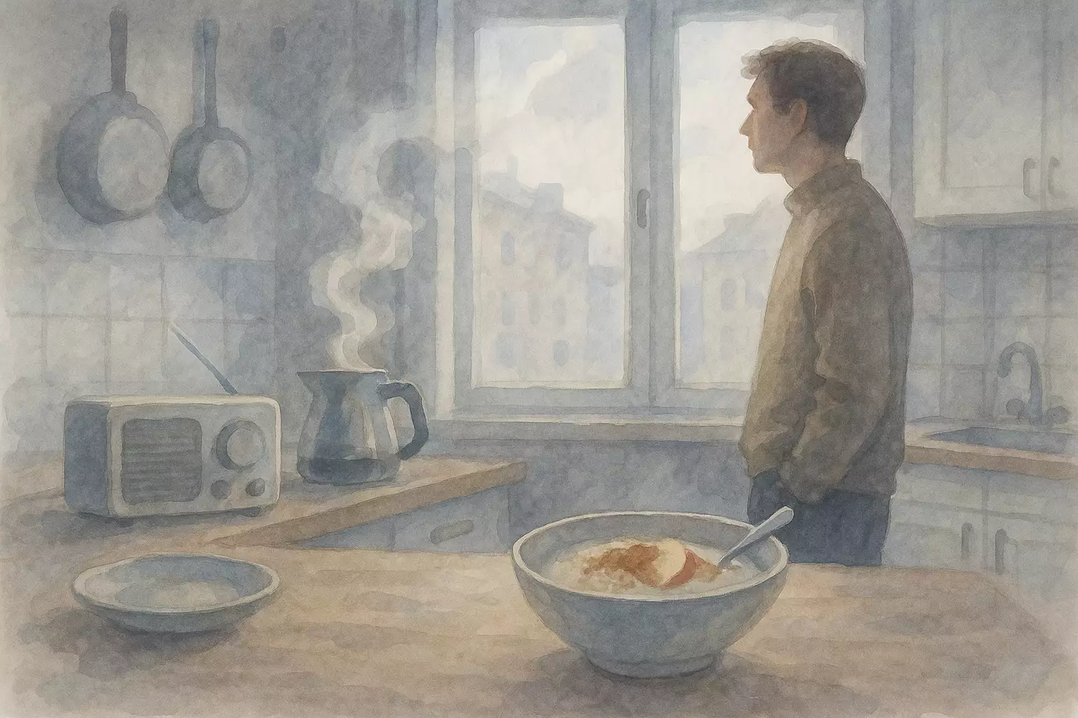 In a gray Stockholm dawn, Johan navigates coffee, chores, and transit delays while finding brief calm in a call from his mother before catching the bus. The story follows his quietly determined morning routine.