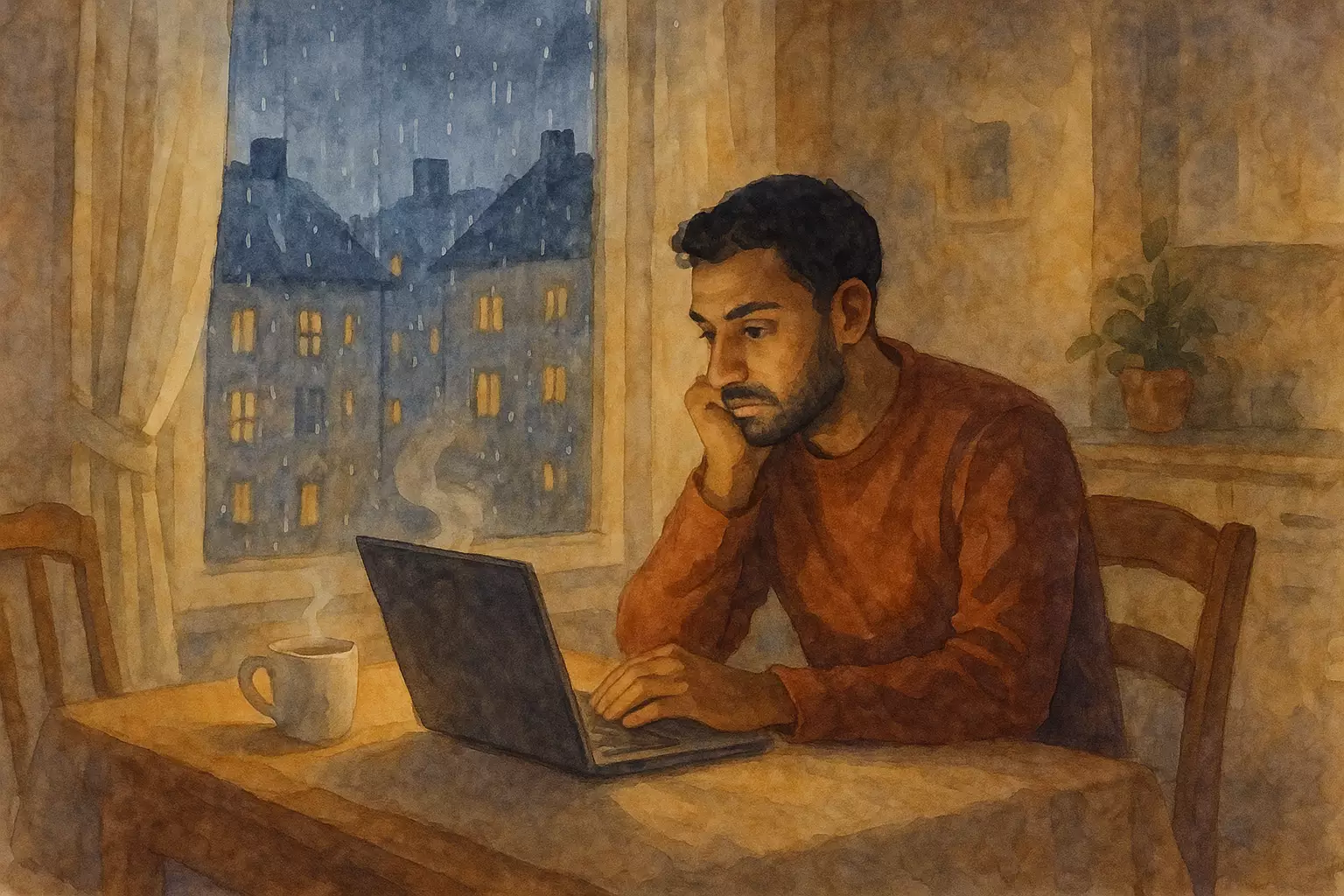 On a rainy evening in Stockholm, Ahmed writes an email to apologize to his friend Sara for missing their fika and carefully chooses his words. After sending it and taking out the glass recycling to calm his nerves, he receives a warm reply and a new plan.