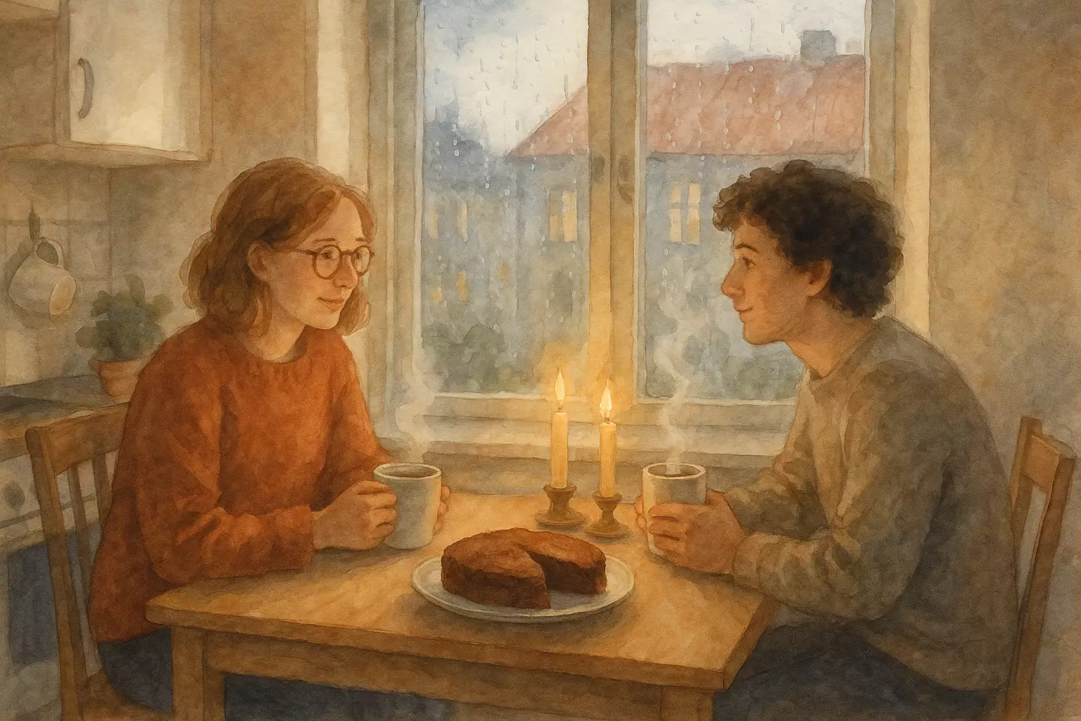 On a rainy Saturday in Malmö, roommates Lina and Amir cancel their plans and make a cozy day indoors with baking, fika, games, and a movie. The rain outside makes the apartment feel extra warm and calm.