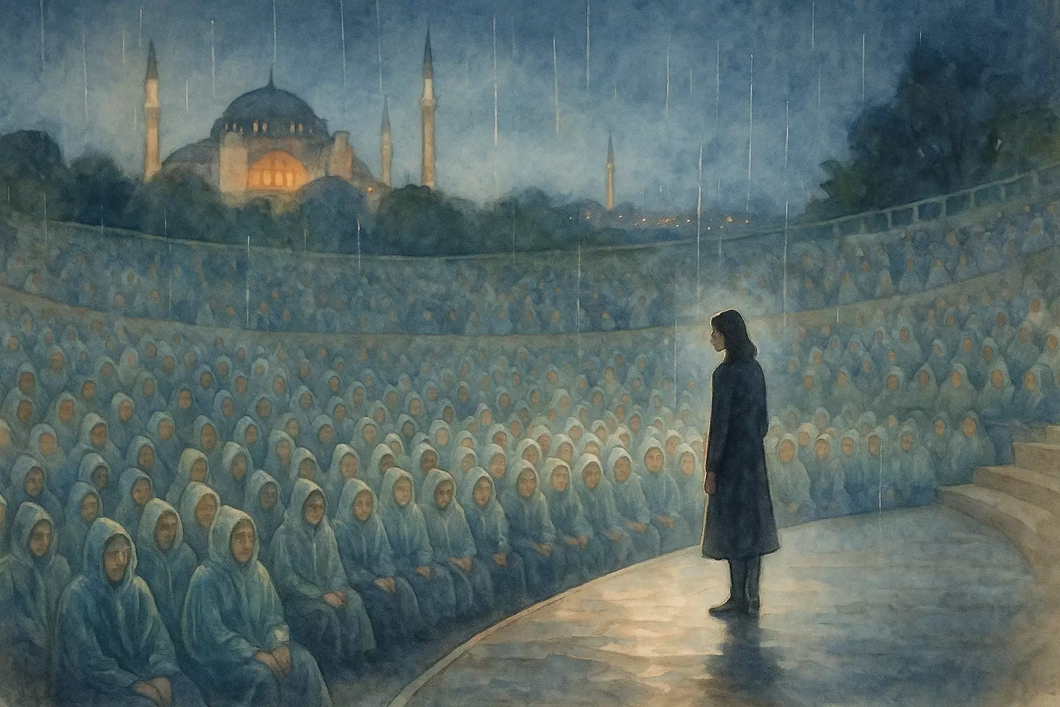 In Istanbul, the narrator and a friend brave a sudden rainstorm at Harbiye Open-Air Theater, where a power outage turns a concert into an intimate acoustic singalong that lifts their spirits. They leave the night feeling renewed and grateful they came.