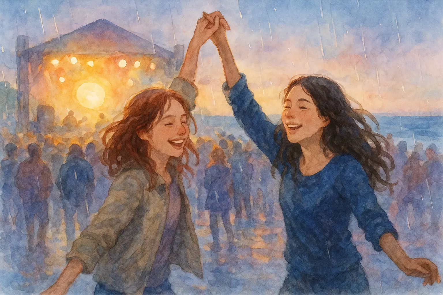 A narrator and their friend Zeynep go to an open-air concert by the sea. Light rain starts, but they keep singing and dancing, and finish the night with hot tea.