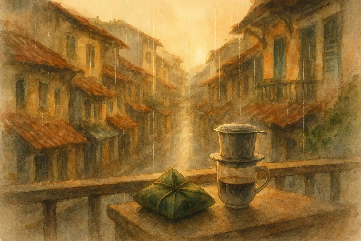 In a Hanoi alley, a young professional’s carefully paced morning—phin coffee, vendor calls, light stretches—steadies the mind before work. Even drizzle can’t shake the calm when the ritual holds.