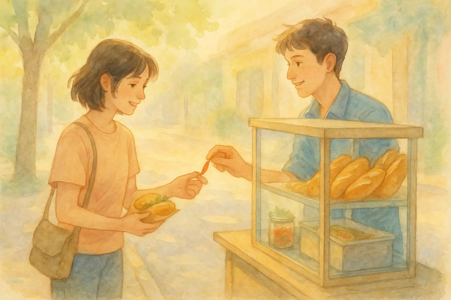 At a busy morning banh mi cart in Vietnam, the narrator meets Linh, who offers chili sauce. They chat, add each other on Zalo, and plan a morning walk together.