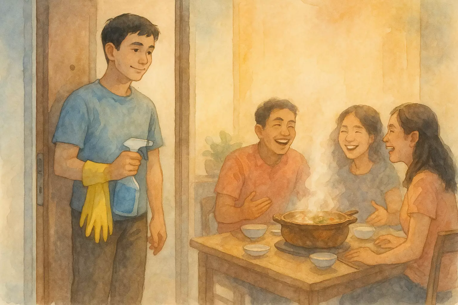 Nam misreads a friend's invitation to eat lẩu mắm as a request to clean serving trays and shows up with cleaning supplies, leading to laughter before everyone enjoys the hotpot. Set at a friend's home in Vietnam on a Saturday evening.