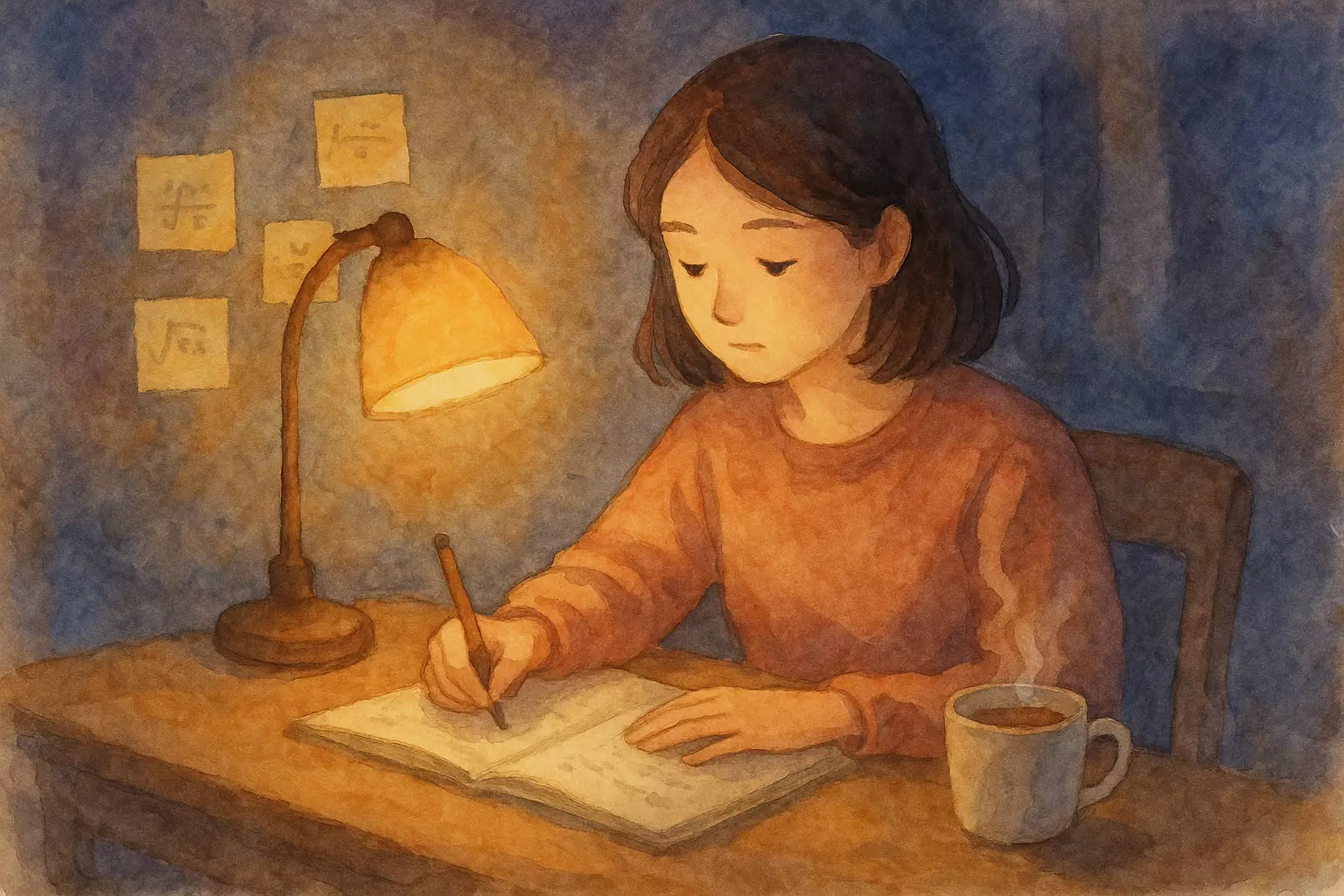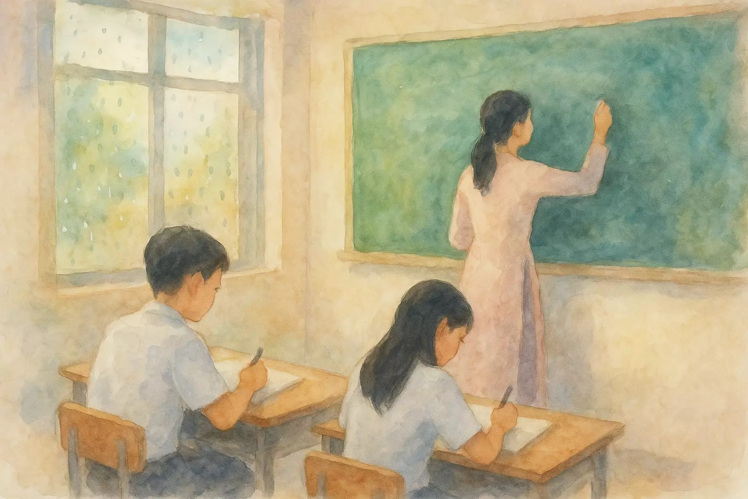 In a small home, Mai prepares for a math test with help from her classmate Tuan and support from her mother. She studies, rests briefly, and enters the exam feeling calmer.