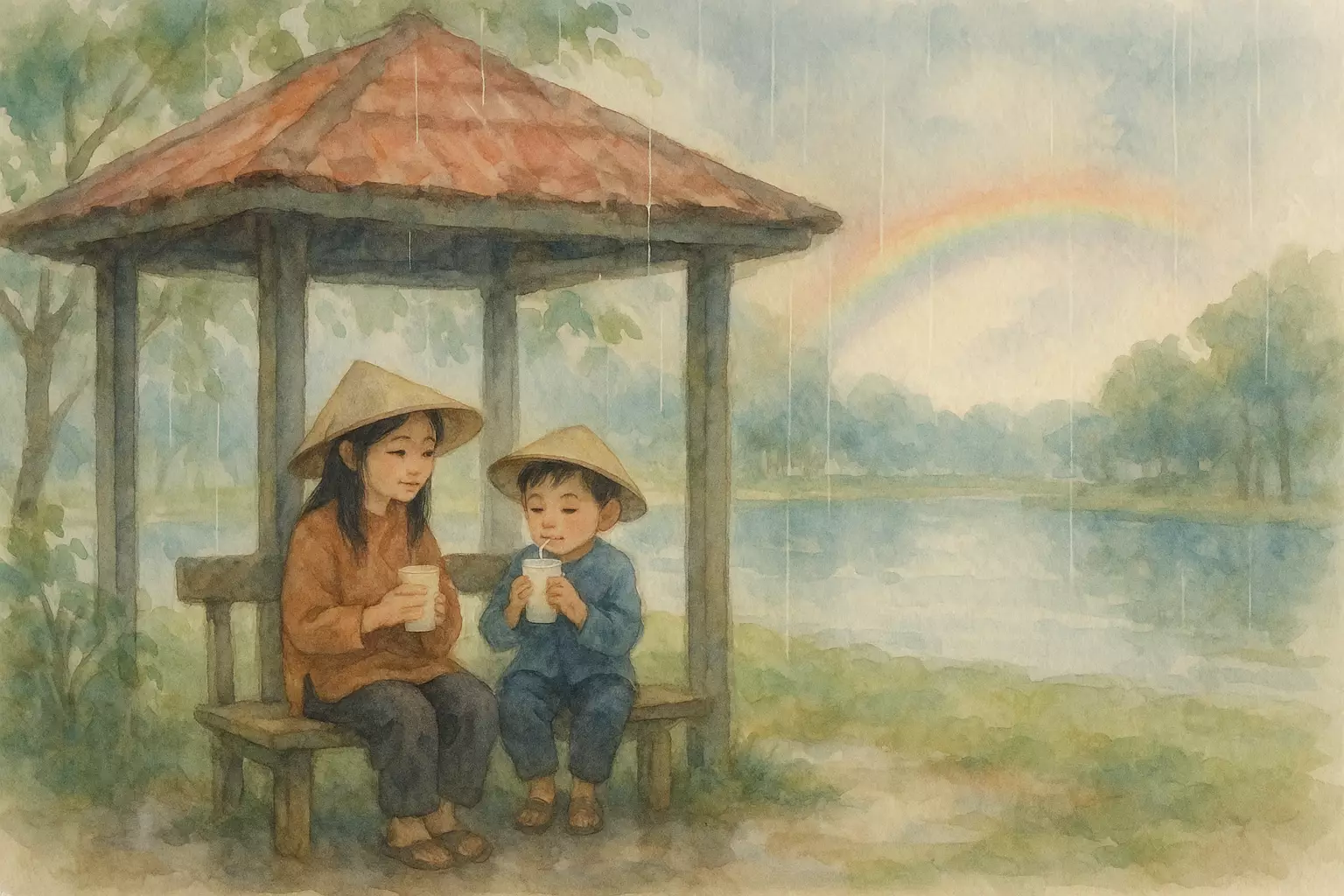 Two siblings spend a Sunday morning at a Vietnamese city park, eating banh mi, flying a kite with help from a guard, sheltering from drizzle, and going home happy. The story follows their small adventures and warm moments.