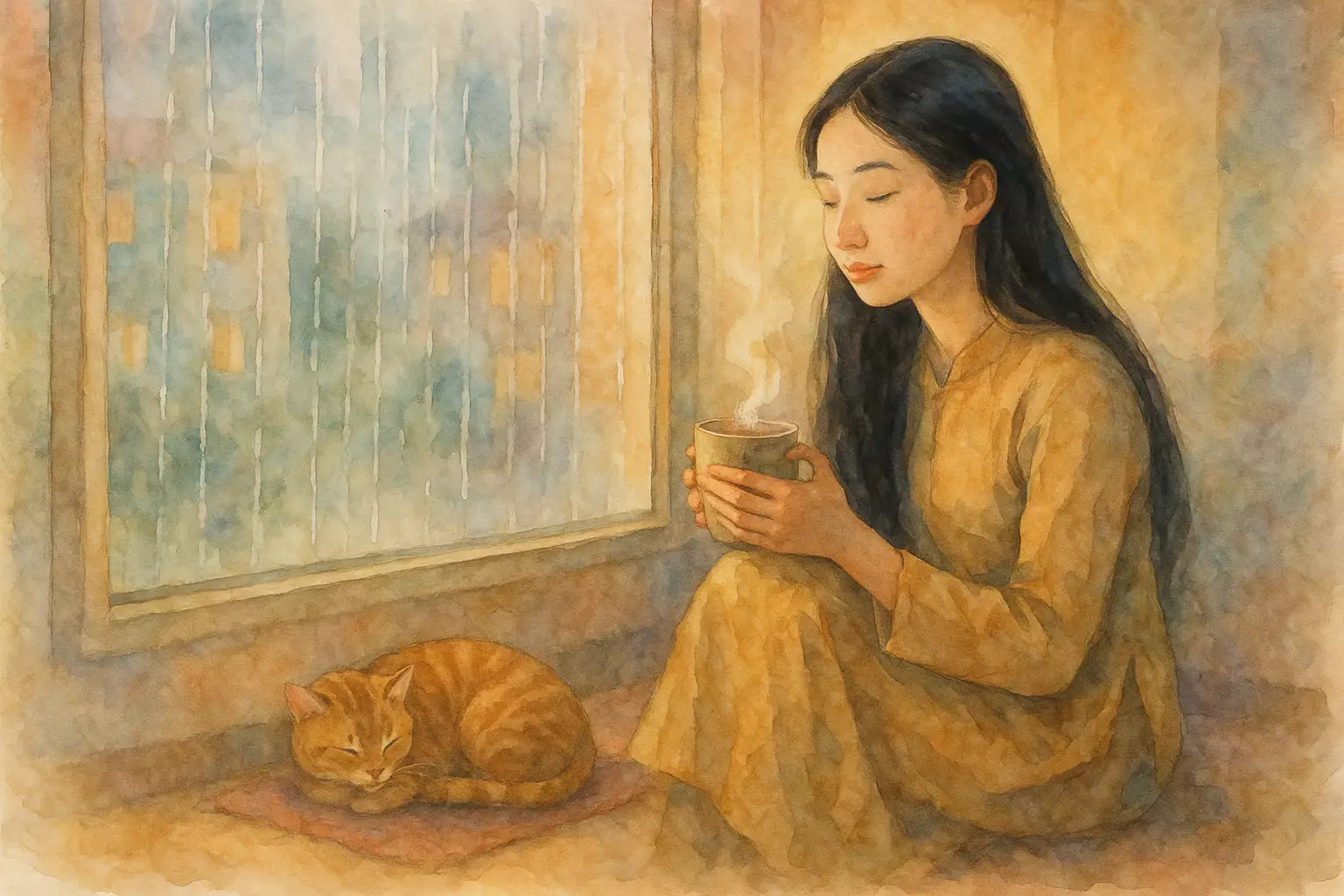 On a rainy Sunday in her apartment, Linh turns a canceled coffee date into a cozy day by making steamed banana cake, listening to music, and savoring the calm indoors. The story shows how staying inside during heavy rain can become its own small comfort.