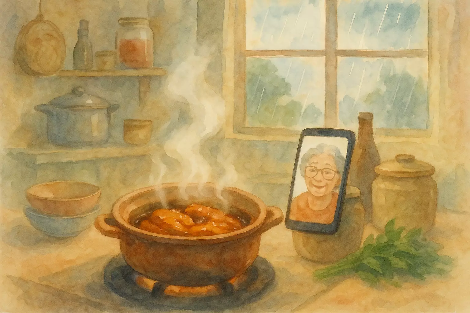 On a drizzly afternoon, a young office worker video-calls their grandmother to learn how to make cá kho tộ. After burning the caramel at first, they fix it with her advice and end up with a comforting meal.